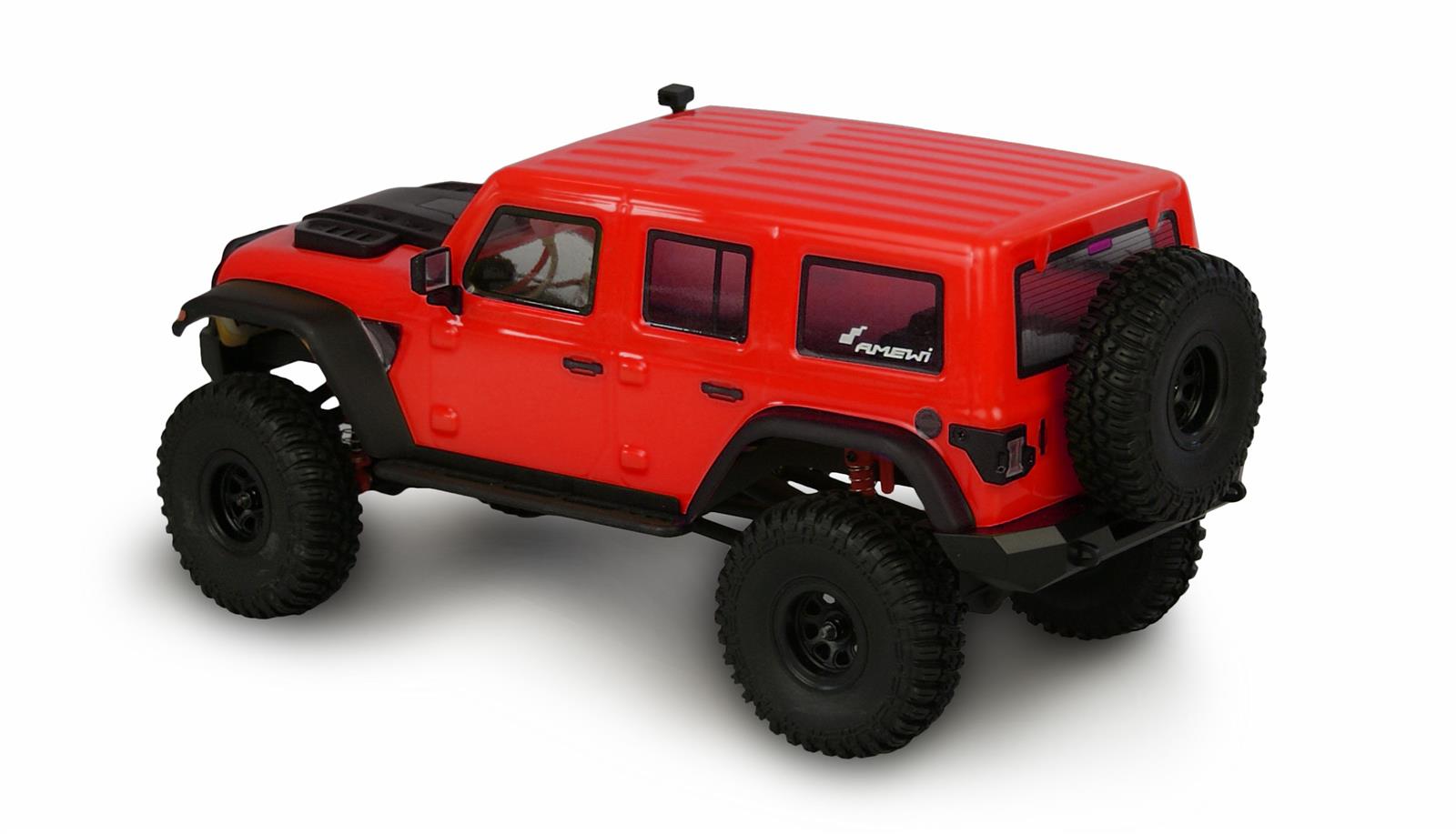 Ausgereifte Technik trifft auf wunderschöne Scale Optik – dieser kleine Scale Crawler bringt alles mit, um in der Liga der Super Crawler mitzuspielen. So verfügt der AMXRock AM18 Kratos gleich über eine ganze Reihe an ergiebigen Features im Stil eines echten Spitzenkletterers: vollwertige Mountainbreak, feinfühliger 3-in-1 Regler mit JR Servo-Anschluss, extra weiche Reifen mit sehr gutem Profil für besten Grip selbst bei rutschigem Untergrund, gesperrte Differentiale, LED-Beleuchtung vorne und hinten, Dämpfer mit viel Federweg für extreme Verwindungen des Chassis, geschütztes Hauptgetriebe mit einer 104:1 Untersetzung und einem kräftigen 050/55T Motor für hohes Drehmoment. Zudem ist das Modell im Maßstab 1:18 komplett wasserdicht und es wird als RTR-Fahrzeug fahrfertig ausgeliefert. Lediglich die Batterien für den Sender (4x 1,5V AAA Micro) sind nicht im Lieferumfang enthalten.