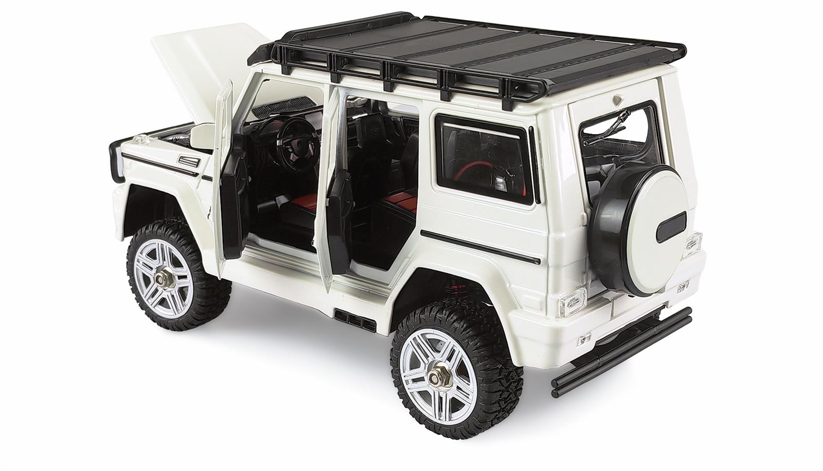 Alle Türen, die Heckklappe (Akkufach) und die Motorhaube mit Motorattrappe sind funktional und lassen sich öffnen. Der Innenraum ist detailliert ausgestattet z.B. mit Sitzen, Lenkrad uns Schalthebel. Der bereits fertig angebaute Dachgepäckträger kann problemlos für Zubehörteile wie z.B. Reservekanister, Erste-Hilfe-Boxen und Traktionsbleche o.ä. genutzt werden. Die handliche Fernsteuerung sendet im störungssicheren 2,4GHz Band. Alle Fahrfunktionen sind proportional.