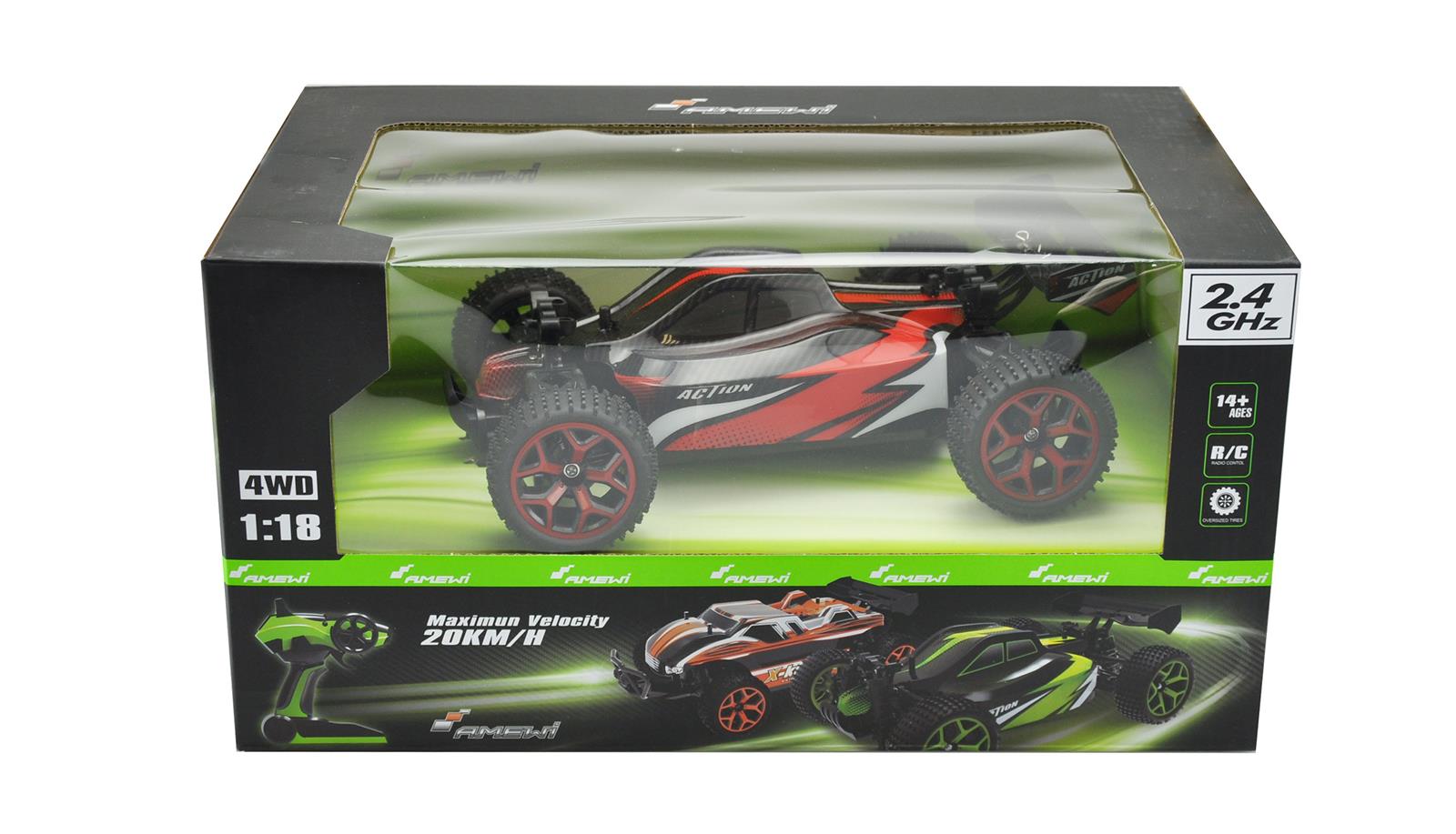 Buggy Storm D5 redKomplett vormontierter und ausgestatteter 4WDBuggy im Maßstab 1:18. Topspeed 20km/h.Fetziges Design. Moderne 2,4GHz Funkfernsteuerung.Robustes Chassis. Bullige und griffige Räder mitviel Grip für viel Spaß im Gelände und auf derStrasse. Die elektronischen Teile und dasGetriebe sind gekapselt und somit vor demEindringen von Staub und Schmutz geschützt.Durch die proportionale Gasfunktion des Modellslässt sich das Modell hervorragend kontrollieren.Der Buggy vermittelt dem Piloten sofortein sicheres Fahrgefühl. Der quirlige und agileBuggy ist die perfekte Wahl für Einsteiger undFortgeschrittene.Technische Daten:Maße: 26 x 19 x 9cm2,4 GHz FunkfernsteuerungFahrzeit: 15-18 Min.Höchstgeschwindigkeit 20 km/hAllradantrieb (4WD)Reichweite: 60mLadezeit 2-3 Stundenproportionale GasfunktionLieferumfang:1 x Buggy Storm D5 red1 x 6V 700mAh NiMH Akku1 x Ladegerät (Ladekabel)1 x Bedienungsanleitung (dt. / engl.)2 x 1,5V AA Mignon Batterie für die Fernsteuerung1 x Bedienungsanleitung (dt. / engl.)