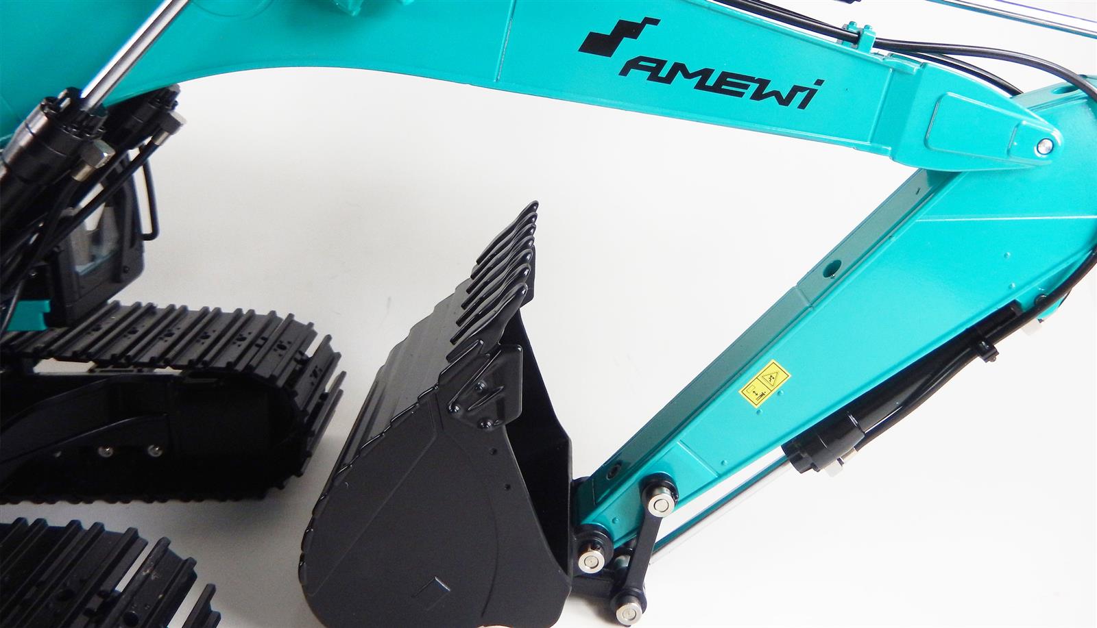 Der G101H ist ein Hydraulik-Vollmetallbagger im Maßstab 1:16, der als RTR Modell im Originaldesign mit einer exklusiven Petrol-Lackierung mit 2,4GHz Sender, Akku, Ladegerät und allem Zubehör, was für den Betrieb erforderlich ist, ausgeliefert wird. Hochwertige Verarbeitung gepaart mit hochwertiger Technik, so lässt sich dieses Modell treffend beschreiben. Der gesamte Aufbau besteht aus Metall. Die Ausleger sowie das Arbeitsgerät (Schaufel) werden hydraulisch bewegt, der Fahrapparat und sogar die Hydraulikpumpe werden elektrisch mit Brushless-Motoren angetrieben. Somit steht genügend Kraft für anstehende Arbeiten zur Verfügung. Das Modell ist dabei sehr feinfühlig über den mitgelieferten 2,4GHz Sender mit Eurosteuerung (Knüppelbelegung wie im echten Bagger) zu bedienen. Die Lieferung dieses Vollmetall-Hydraulikbagger erfolgt in einer stabilen Echtholzkiste. Alle Modelle werden vor der Auslieferung von unseren Technikern geprüft und getestet.