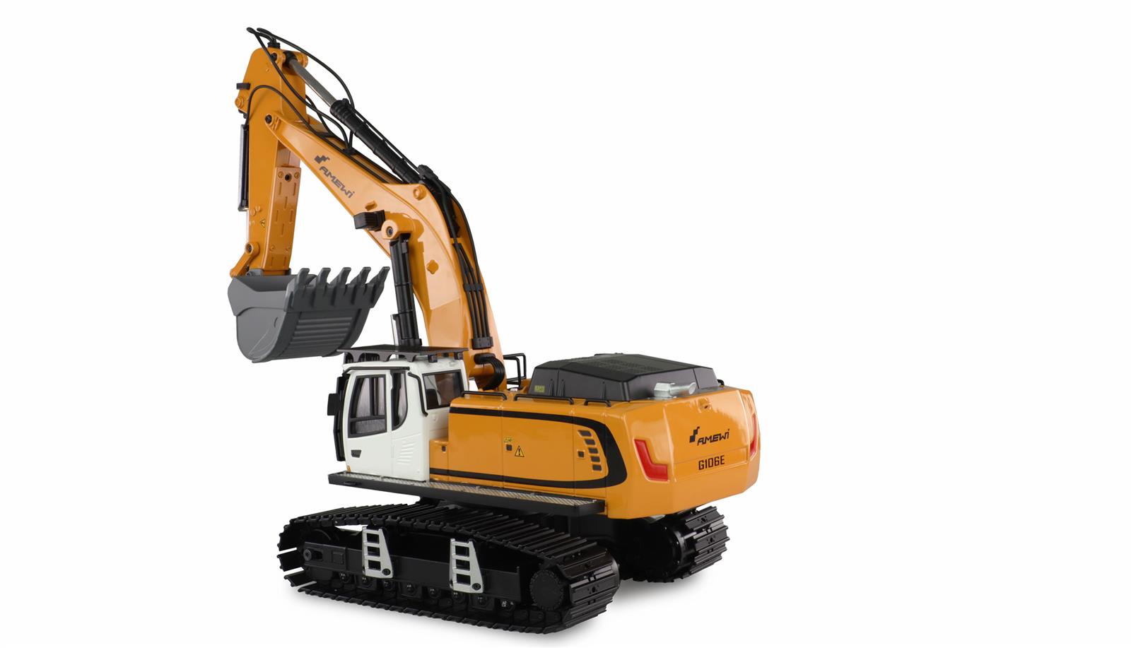 Mit seiner Fähigkeit, 23 Kanäle anzusteuern, dringt der G106E in das Segment des hochwertigen Funktionsmodellbaus vor. Die Geländefähigkeit in Verbindung mit der spritzwassergeschützten Elektronik sorgt für ungetrübten Spaß bei gleichzeitig langer Haltbarkeit der einzelnen Komponenten. Der Löffel mit hohem Fassungsvermögen ist aus Metall gefertigt. Das Modell verfügt zudem über kräftige Stellmotoren, welche auch schwere Lasten problemlos bewältigen.