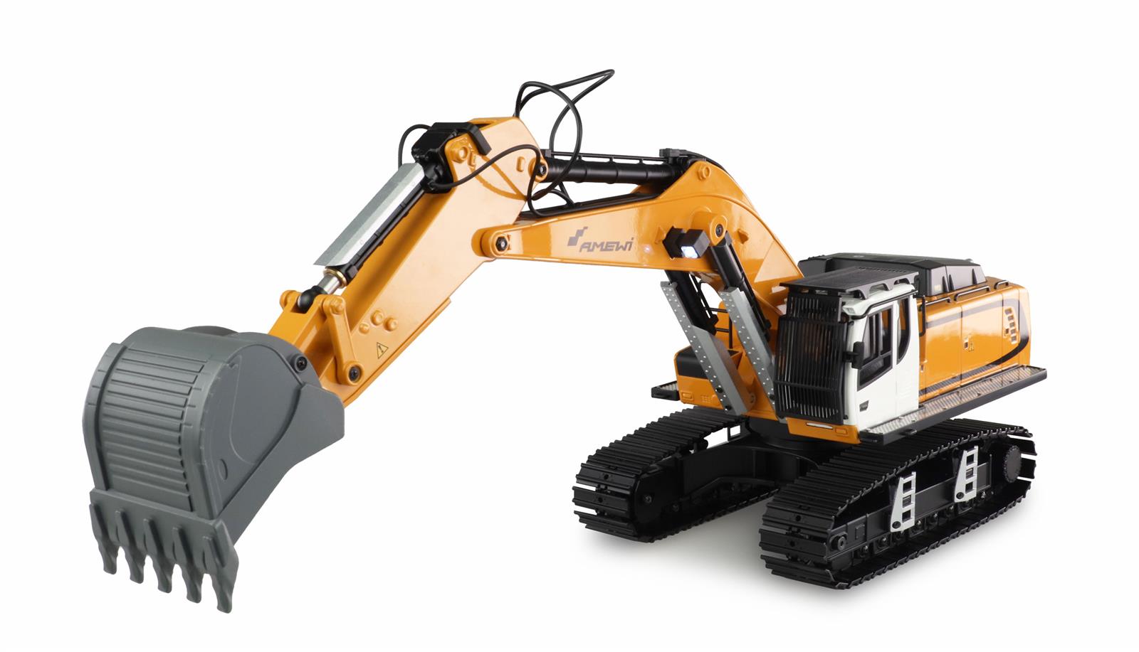 Der ferngesteuerte Bagger G106E im Maßstab 1:14 beeindruckt durch seine Vollmetallkonstruktion. Jeder Aspekt dieses Baustellen-Modells, vom Löffelstiel über den Ausleger bis hin zum Löffel, ist separat steuerbar. Mit einem integrierten Soundmodul und einem 360° drehbaren Oberwagen (max. 680°) bietet dieses Nutzfahrzeug mit der Gesamtlänge von 61cm ein abwechslungsreiches Arbeitserlebnis. Optisch erinnert der Kettenbagger an das hydraulische Amewi-Großmodell G308H und besticht durch die originalgetreue Lackierung in funkelndem Gelb-Ton.