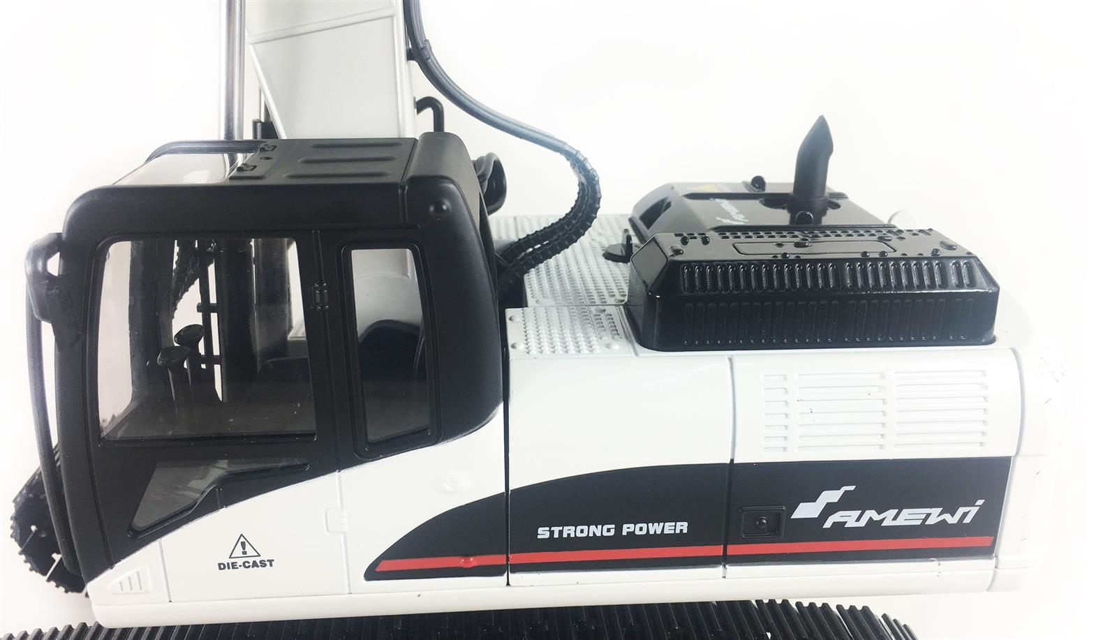 Dieser Vollmetall Bagger im Maßstab 1:14 als exklusive Amewi Edition lässt fast keine Wünsche offen. Der Arm, die Schaufel, der gesamte Aufbau und jede Kette ist separat steuerbar. Das Modell verfügt zudem über einen Sound- und Rauchgenerator. Der Turm ist 360°. endlos drehbar.Dieses hochwertig verarbeitete und maßstabsgetreue Modell eines Kettenbaggers schließt die Lücke zwischen Spielzeug und high-end Funktionsmodellbau. Insgesamt können bei dem Vollmetallbagger 23 Kanäle angesteuert werden. Somit steht das Modell dem Original in nichts nach. Die Geländefähigkeit in Verbindung mit der spritzwassergeschützten Elektronik sorgen für ungetrübten Spaß und für eine lange Haltbarkeit der einzelnen Komponenten.Zusätzlich liegt dem Bagger ein Holzgreifer, ein Bohrhammer und eine zweite kleinere Schaufel aus Metall bei. Somit kann das Modell mit wenigen Handgriffen umgebaut werden. Alle Getriebeteile sind aus Metall und das Modell verfügt zudem über kräftige Stellmotoren, welche auch schwere Lasten problemlos bewältigen. Die Qualität und detailtreue dieses Modells sind bisher als RTR Modell einzigartig.Features:Große Schaufel weiß lackiert, eine kleinere ist ebenfalls im Lieferumfang enthaltenNeue verbesserte ElektronikVerbesserte Abschaltelektronik für den ArmVerbesserte Antriebstechnik für den AufbauExklusive Amewi EditionReichhaltiger LieferumfangTechnische Daten:Aufbau: VollmetallAntrieb: Metallketten einzeln steuerbarMaßstab: 1:14Abmessungen: 700 x 480 x 180mmGewicht: ca. 7 kgKanalanzahl: 23 KanäleFrequenz: 2,4GHzBatterie: LI-ION 7.4V 2000MAHFunktion: vorwärts, rückwärts, links, rechts, Aufbau nach links, Aufbau rechts, großer Arm rauf / runter, kleiner Arm rauf / runter, Schaufel auf / ab, Licht, Ton, Demomodus, Rauchgenerator an / aus, Jede Kette einzeln steuerbar, auf der Stelle drehen, während der Fahrt drehen, Sound an / ausLieferumfang:Bagger 1:14 Metall RTR weißAkku 7,4V Li-Ion 2000mAhSender 2,4GHzLadegerät USBAnleitungKleine SchaufelBohrhammer MetallHolzgreifer MetallRauchölSchraubendreherBenötigtes Zubehör:Senderbatterie: 3 x 1.5V AA Mignon>>>>GPSR>>>AMEWI Trade GmbH ;Nikolaus-Otto-Str. 18;D - 33178 Borchen;Tel.: +49 5251 288965-0;E-Mail: info@amewi.com ;Web: www.amewi.com