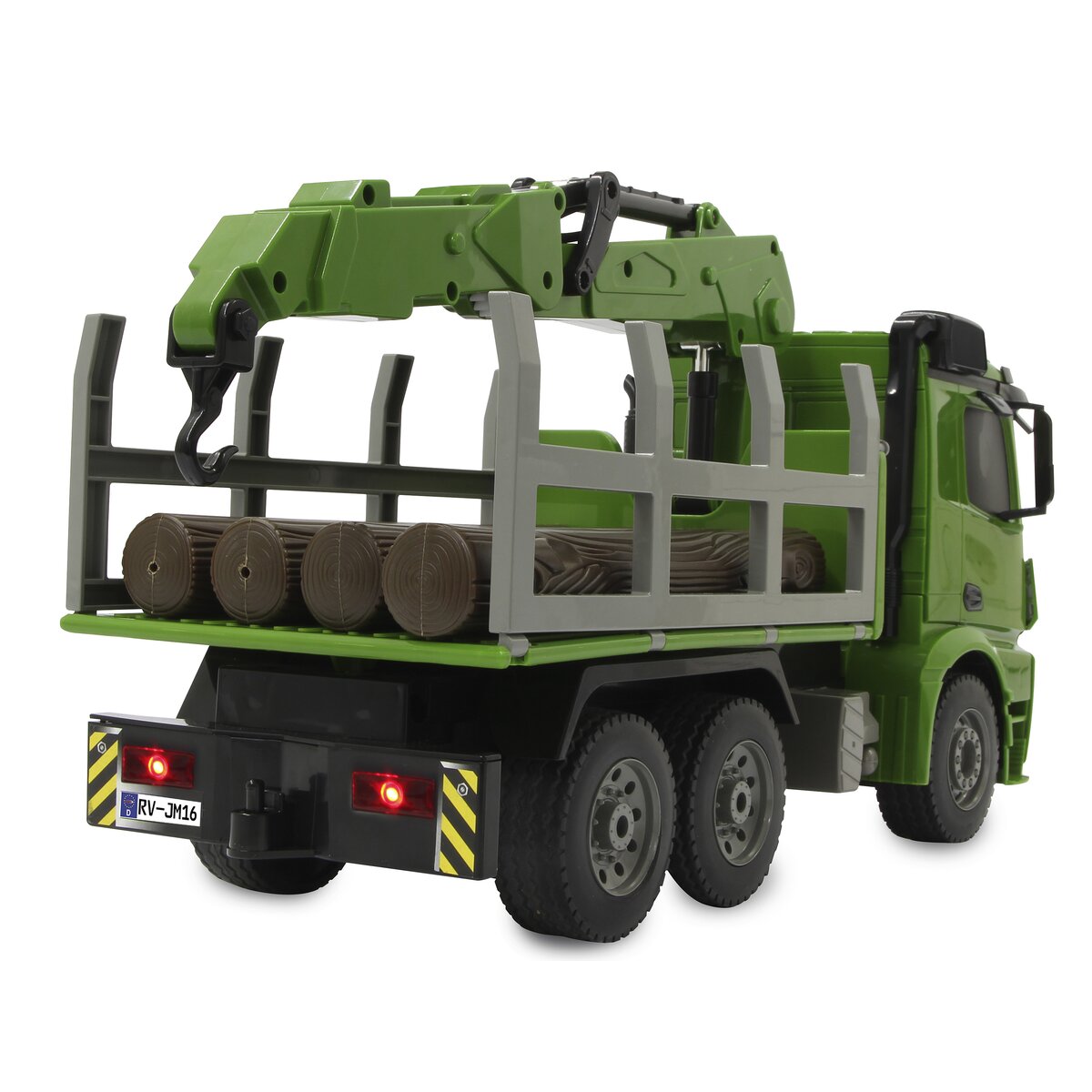 Wenn die Waldarbeiter ihre Arbeit getan haben kommt der große Holztransporter und holt die Baumstämme aus dem Wald. JAMARA bringt hierfür ein tolles fernsteuerbares Spielzeug in die heimischen Kinderzimmer. Ein Mercedes-Benz Holztransporter mit steuerbarem Kran und einem Holzstamm-Greifer der über die Fernsteuerung die vier enthaltenen Holzstämme auf und von der Ladefläche heben und legen kann. Nach der Fahrt mit dem lizensierten LKW einfach die Bordwände herunterklappen und schon können die Holzstämme wieder entladen werden, ganz wie im Original. Praktisch, der Greifer kann gegen dem im Lieferumfang enthaltenen Lasthaken getauscht werden. So wir aus dem Greifarm ein Lastkran für spezielle Werkaufgaben. Blinker, LED-Lichter, Motorsound, Hupe und Rückwärtswarnsound sind nur einige weitere tolle Features die wir dem Holztransporter mitgegeben haben. Der waldgrüne Lastwagen kann ab sofort für den Handel bevorratet werden.