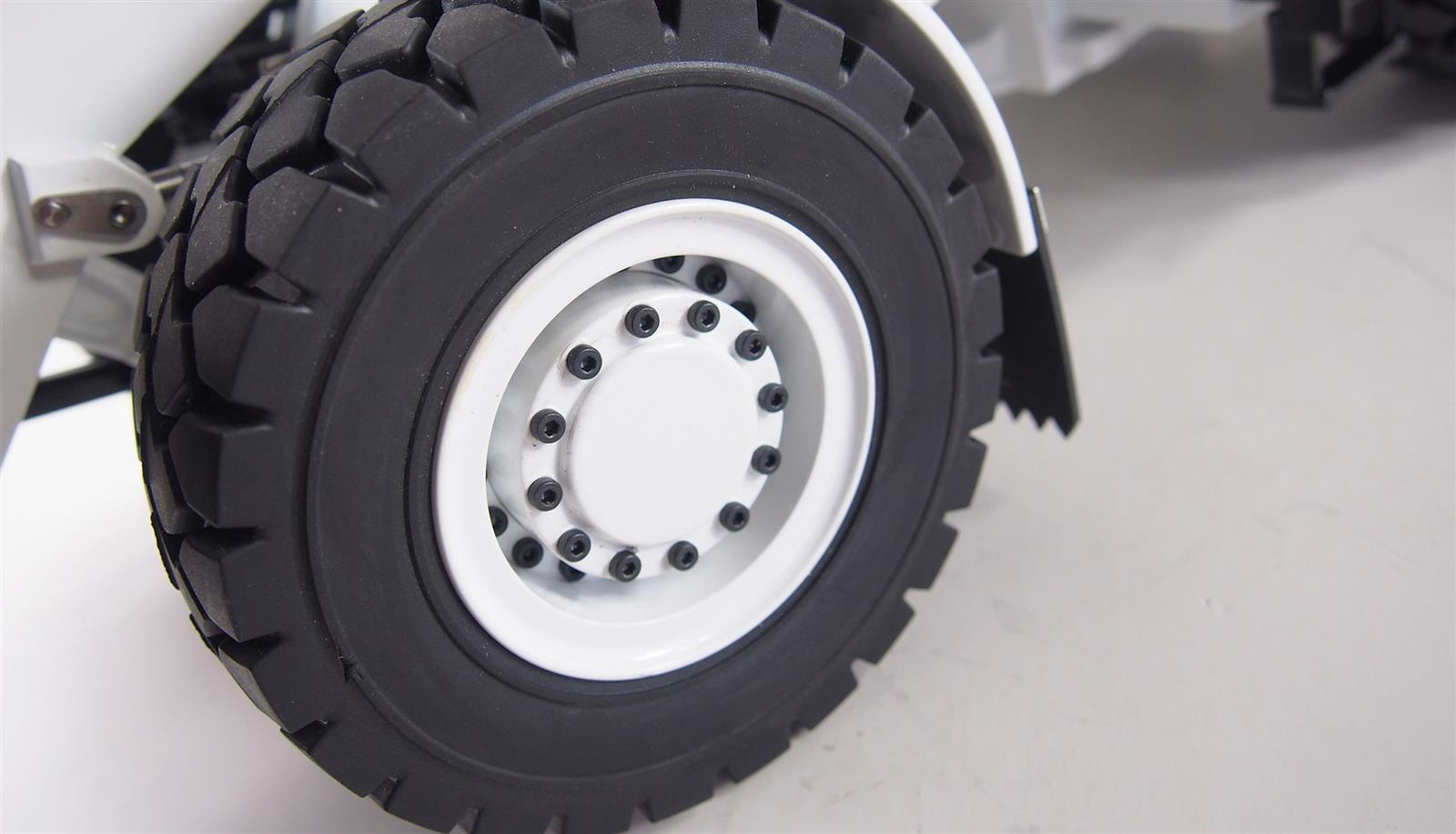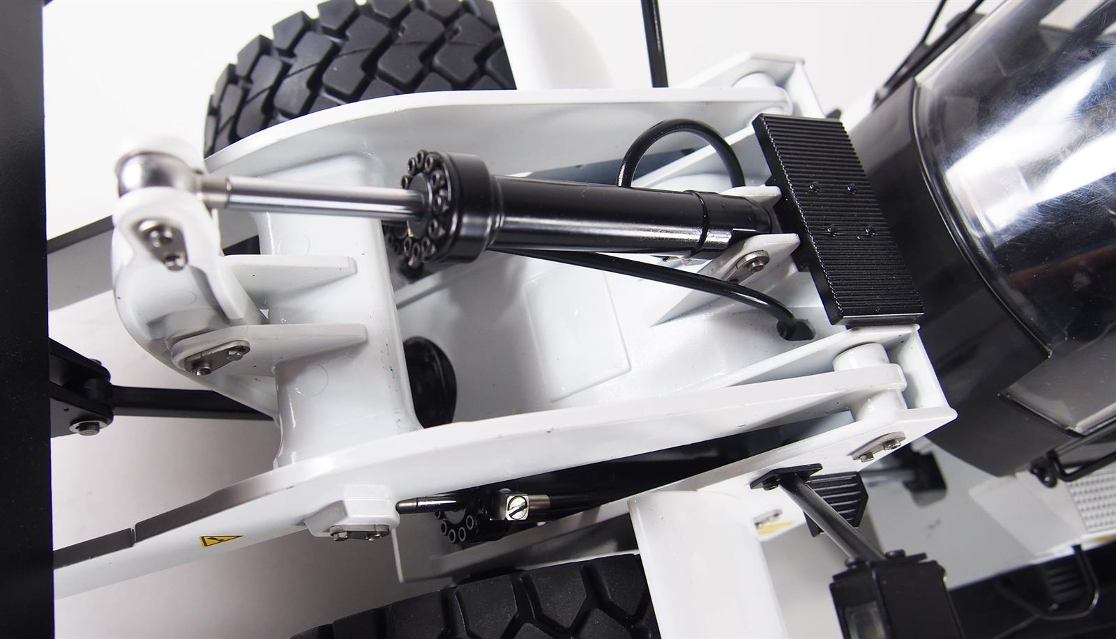 Hydraulik-Scale-Nachbau eines bekannten Radladers in Vollmetall und weißer-Lackierung, der mit sperrbaren Differentialen, 2-Gang-Schaltgetriebe und Pendelachse für ein außergewöhnliches Fahrerlebnis sorgt. Diese ca. 11kg schwere Baumaschine im Maßstab 1:16 lässt sich dank seiner Vollgummireifen auf nahezu jedem Untergrund bewegen. Die Kraft des Auslegers, des Brushless-Antriebes und der hydraulikgesteuerten Schaufel sind im Vergleich zu seinem Eigengewicht überdurchschnittlich stark und ermöglichen ein problemloses Arbeiten auch mit schwerem Material wie Erde, Kies oder anderem Schüttgut.