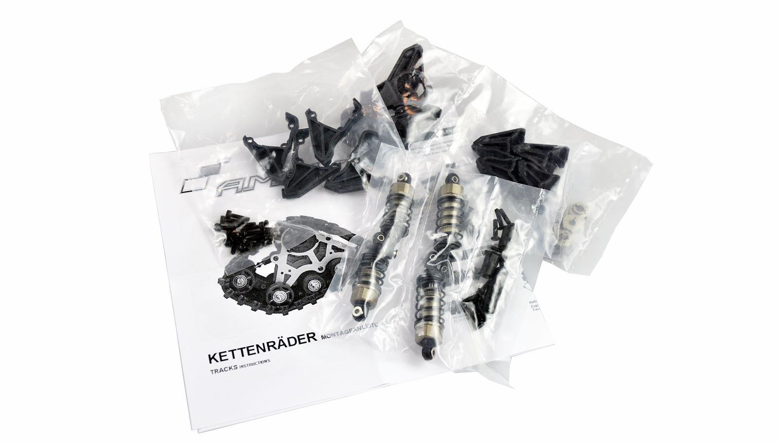 Hochwertiges Kettenfahrwerk für den Einsatz in unwegsamen Gelände wie z.B. Sand, Schnee und Matsch.Das gesamte Chassis des Fahrwerks wurde aus Metall gefertigt und mit insgesamt 64 Präzisionskugellager versehen. Die Antriebsräder sind mit Stahlwellen ausgestattet und die gesamte Laufeinheit ist versiegelt.Somit ist das Fahrwerk problemlos Allwettertauglich und die Kettenspannung ist über ein rechts / links Gewinde einstellbar. An der Innenseite des Fahrwerks wird ein hochwertiger Öldruckdämpfer als Verdrehschutz montiert, der das Fahrwerk zusätzlich präzise in der Spur hält. Dank des durchdachten Aufbaus kann dieses Fahrwerk problemlos auf jedem Untergrund und mit hoher Geschwindigkeit (z.B. im zweiten Gang unseres RCX Crawlers) gefahren werden. Dem Set liegen noch Adapter für z.B. TRX4 und SCX10 II bei, somit ist das Fahrwerk für unterschiedliche Fahrzeugtypen mit Portalachsen nutzbar.Technische Daten:Länge: 175mmBreite: 48mmHöhe: 102mmGewicht pro Stück: ca. 375gAufnahme: 12mmMaterial: Aluminium (Rahmen) / Gummi (Ketten)Lieferumfang:4x Kettenfahrwerk Gun Metal2x Öldruckdämpfer kurz vorne2x Öldruckdämpfer lang hinten4x Distanzhülsen4x Adapter für TRX44x Adapter für SCX10 II+4x Adapter für RCX8 und RCX104x 12mm Radmitnehmer in Aluminium, verschraubbarSchraubenset Aufbauanleitung DE / EN bebildert>>>>GPSR>>>AMEWI Trade GmbH ;Nikolaus-Otto-Str. 18;D - 33178 Borchen;Tel.: +49 5251 288965-0;E-Mail: info@amewi.com ;Web: www.amewi.com