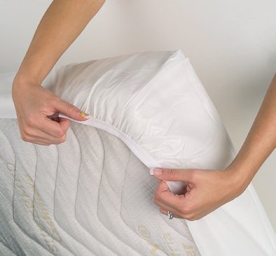 Produktdetails: aus wasserundurchlässiger Kunststofffolie | wie ein Spannlaken gearbeitet | an den Ecken verschweißt | weich und hygienisch | mit Gummizug.