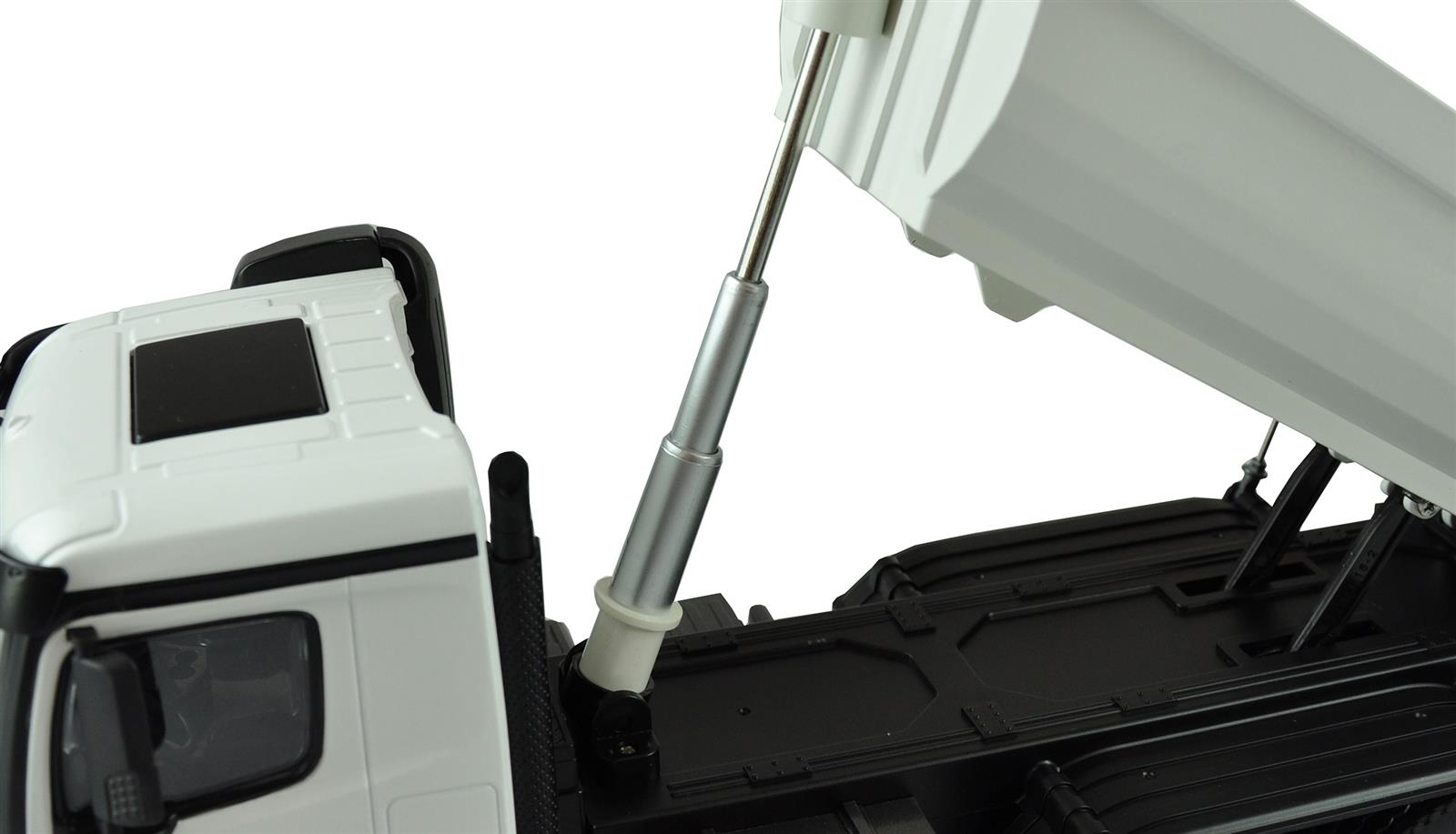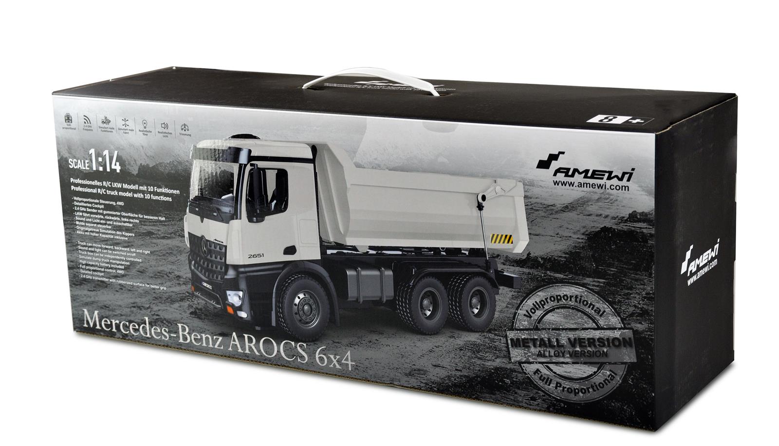 Tolles Scale Modell eines Mercedes Arocs Kippers in exklusiver weißer Lackierung passend zu unseren Vollmetallbaggern und Radladern. (22415 / 22416) Arocs ist die Bezeichnung der berühmten LKW Baureihe der Marke Mercedes-Benz der Daimler AG.