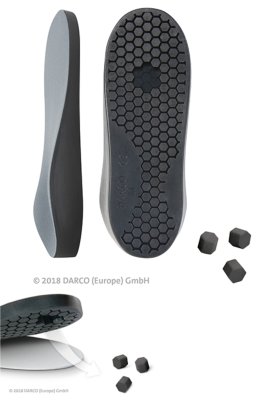 Produktdetails: zur plantaren Druckverteilung | beschleifbares PU-Material | einzeln herausnehmbare Waben zur individuellen Anpassung | dünne Schicht aus EVA fixiert den bearbeiteten Bereich und verhindert ein Verrutschen der angrenzenden Waben | laterale und mediale Längswölbung, sowie proximale Querwölbung gewährleisten eine ideale Lastumverteilung | Druck wird bis zu 55% reduziert.