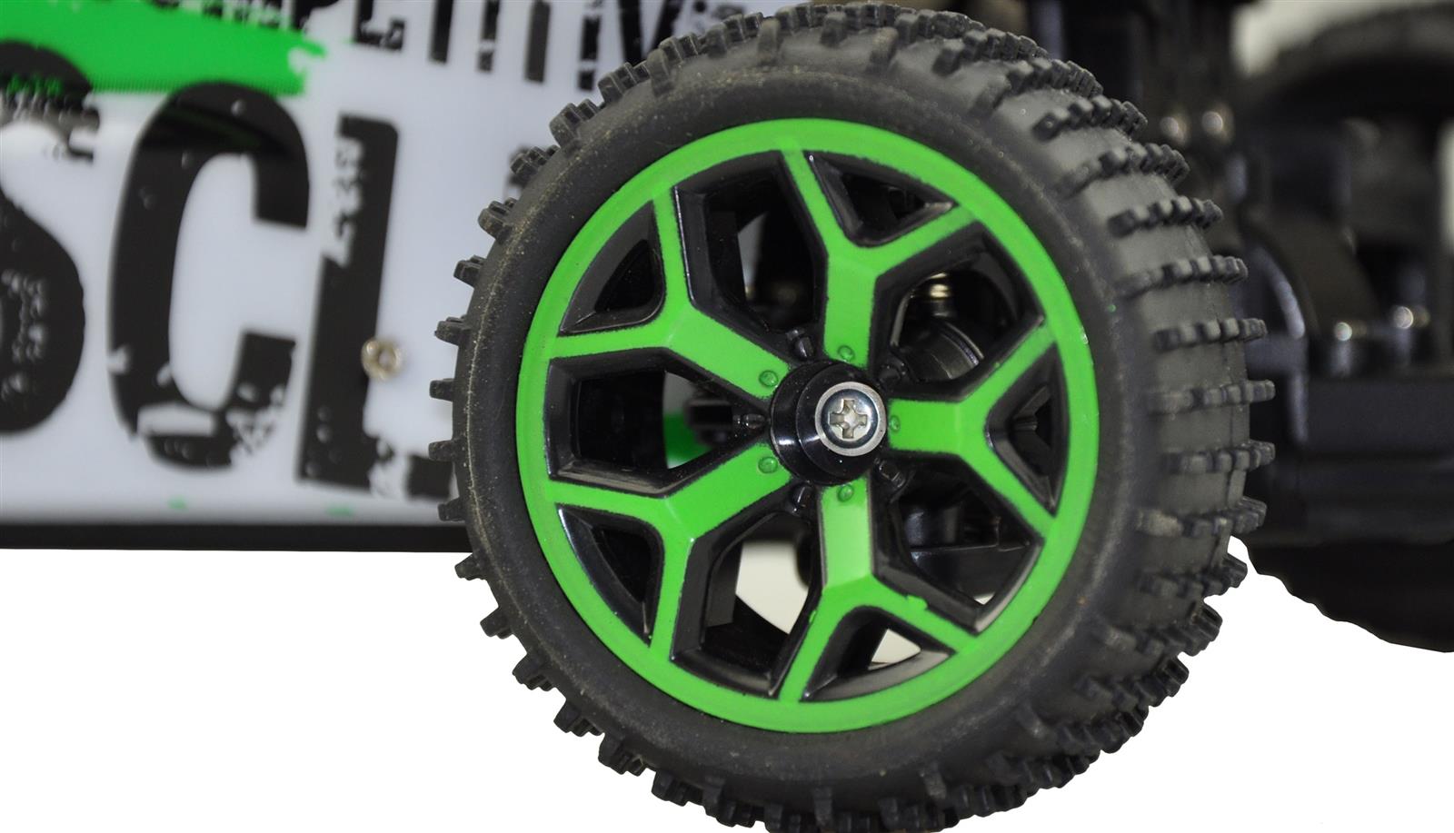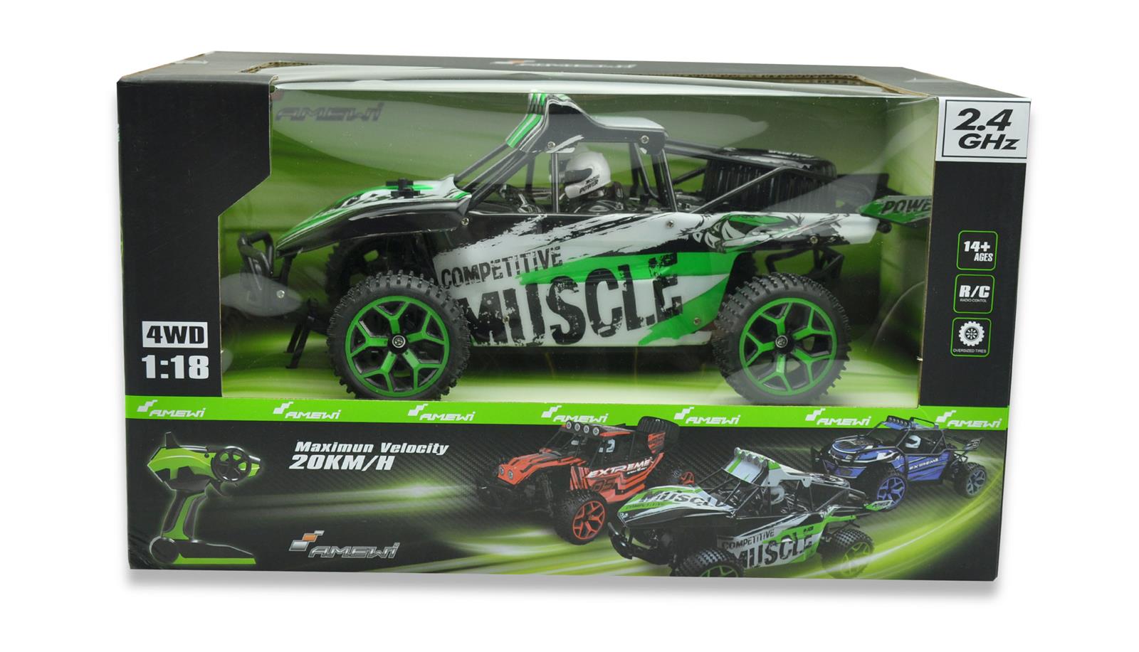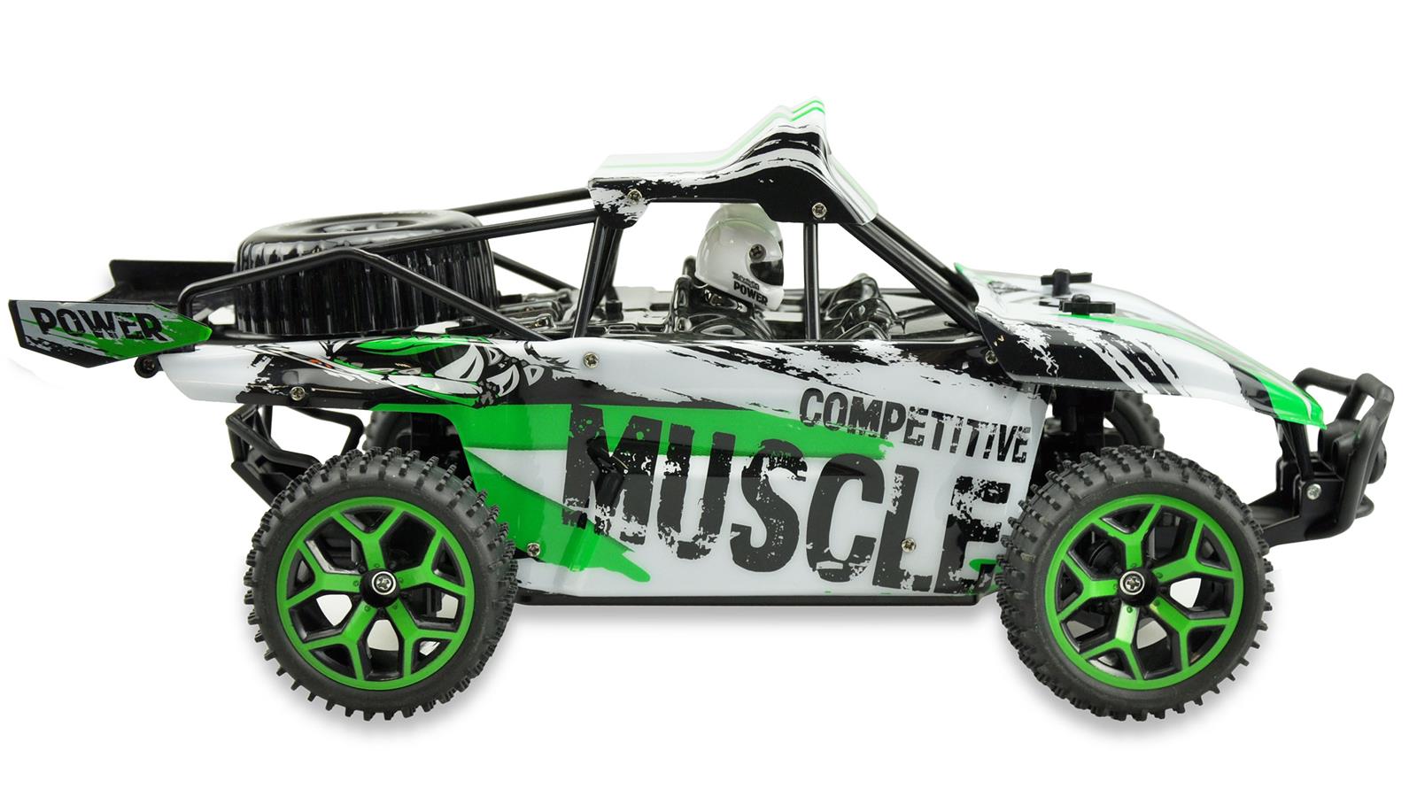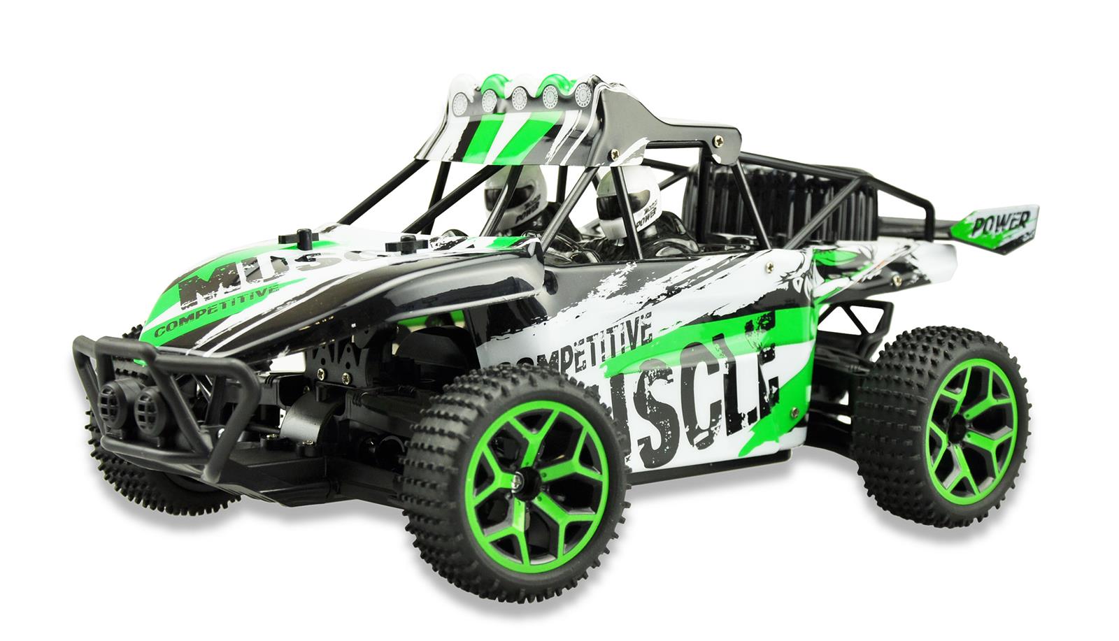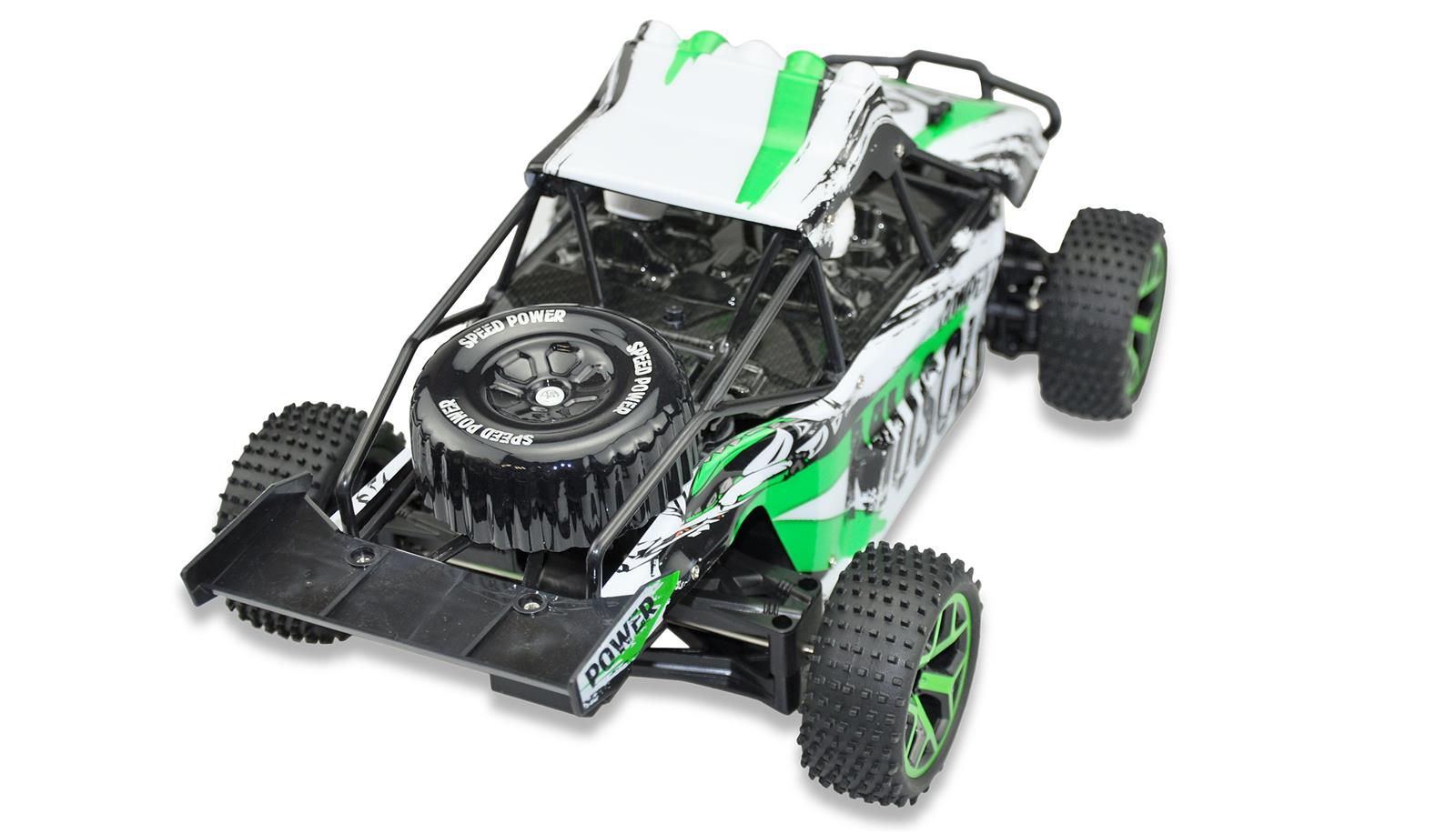 Sand Buggy Extreme D5 greenKomplett vormontierter und ausgestatteter 4WDSand Buggy im Maßstab 1:18. Topspeed 20km/h.Frisches Design. Moderne 2,4GHz Funkfernsteuerung.Robustes Chassis. Gummireifen mit viel Grip undstylischen Felgen für viel Spaß im Gelände undauf der Strasse. Die elektronischen Teile und dasGetriebe sind gekapselt und somit vor demEindringen von Staub und Schmutz geschützt.Durch die proportionale Gasfunktion des Modellslässt sich das Modell hervorragend kontrollieren.Der Sandbuggy vermittelt dem Piloten sofortein sicheres Fahrgefühl. Der quirlige und agileBuggy ist die perfekte Wahl für Einsteiger undFortgeschrittene.Technische Daten:Maße: 32 x 18 x 13,5 cm2,4 GHz FunkfernsteuerungFahrzeit: 15-18 Min.Höchstgeschwindigkeit 20 km/hAllradantrieb (4WD)Reichweite: 60mLadezeit 2-3 Stundenproportionale GasfunktionLieferumfang:1 x Sand Buggy Extreme D5 green1 x 6V 700mAh NiMH Akku1 x Ladegerät (Ladekabel)1 x Bedienungsanleitung (dt. / engl.)2 x 1,5V AA Mignon Batterie für die Fernsteuerung1 x Bedienungsanleitung (dt. / engl.)