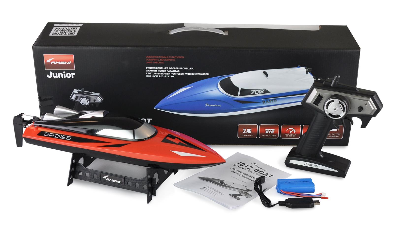 Schickes schnelles Rennboot in der 400mm Klasse. Fertig aufgebaut (RTR) inkl. Li-Ion Akku, Ladegerät und Batterie für den Sender. Einfach Akku laden und ab auf den See! Bei Geschwindigkeiten bis zu 25km/h ist Fahrspaß garantiert und die Fahrzeit beträgt bis zu 8 min. Die Reichweite des 2,4Ghz Systems beträgt bis zu 80m und dank des geschlossenen Aufbaus ist ein Kentern fast unmöglich. Sollte doch mal etwas passieren, ist es auch nicht so schlimm, da der gesamte Aufbau des hochwertigen Bootes Spritzwassergeschützt ist. Eine voll proportionale Steuerung ermöglicht ein sehr feinfühliges Fahrvergnügen und die vom Sender aus einstellbare Trimmung für das Ruder runden den Gesamteindruck dieses Modells ab. Zusätzlich ist eine Sicherheitsschaltung im Modellrumpf eingebaut. Diese schaltet den Antrieb erst in Verbindung mit Wasser frei. Der Motor kann also nicht unkontrolliert anlaufen und das Verletzungsrisiko wird hier reduziert! Neu in dieser Klasse ist der integrierte Rückwärtsgang. So kommen sie auch aus schwierigen Situationen problemlos wieder raus.FeaturesVorwärts / RückwärtsRechts / linksSehr schnell (bis zu 25km/h)Störungssicheres 2,4GHz SystemLange Fahrzeit (bis zu 8 min.)Wechselbarer AkkuMono Rumpf aus Schlägzähem ABSRTR Modell (alles enthalten)Voll proportionale SteuerungAbgedichtete Haube (gegen Wasser)Sicherheitsschaltung (Funktion nur im Wasser)Technische Daten:Länge: 460mmBreite: 120mmHöhe: 116mmGewicht: ca. 500grAkku: LiIon 7,4V 1100mAhMax. Geschwindigkeit: 25km/hMax. Reichweite: 80mFahrzeit: ca. 8 MinutenLadezeit: ca. 180 MinutenLieferumfang:Modell in rotSender 2,4GhzAkku 1100mAh Li-Ion 7,4VSteckerladegerät9V Block Batterie für SenderBootständer in ABSAnleitung D / Eng>>>>GPSR>>>AMEWI Trade GmbH ;Nikolaus-Otto-Str. 18;D - 33178 Borchen;Tel.: +49 5251 288965-0;E-Mail: info@amewi.com ;Web: www.amewi.com